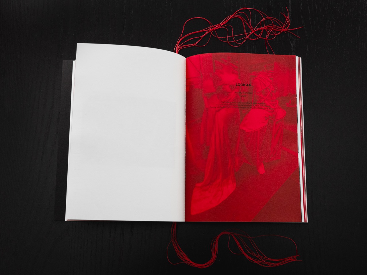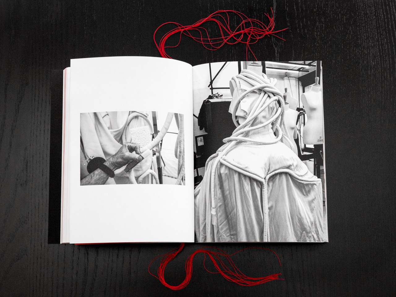 Ce livre documente en images tout le processus invisible qui redonne vie aux vêtements, entre gestes techniques et attention sensible. Le dos de l’édition est laqué en rouge et les fils de couture rouges cousus à même l’objet.